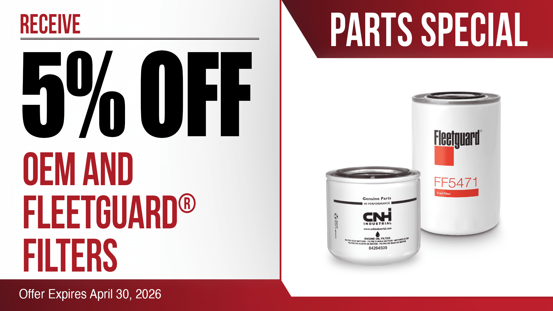 Detail: Customer will receive 5% off OEM and Fleetguard filters.. Offer applies to eligible products purchased between 3/1/2026 and 4/30/2026 at participating Case IH dealers. Offer is nontransferable. Maximum of $500 rebate per customer for the offer period. Submission must be received no later than 5/31/2026. For end use only – not intended for wholesale.