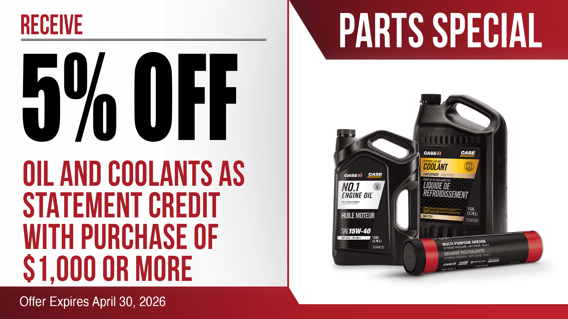 Details: Customer earns 5% back in the form of a statement credit when you cumulatively spend $1,000 or more during the offer period on qualifying OEM lubricants using your Productivity Plus℠ Account.